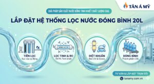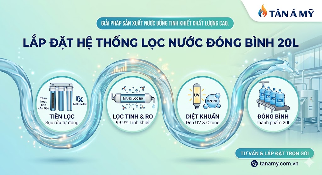 Kinh doanh nước uống đóng bình 20L là một lĩnh vực tiềm năng, nhưng đòi hỏi sự khắt khe về tiêu chuẩn vệ sinh và chất lượng nguồn nước. Tân Á Mỹ cung cấp giải pháp trọn gói từ tư vấn thiết kế đến thi công lắp đặt dây chuyền sản xuất nước tinh khiết, giúp khách hàng sở hữu hệ thống vận hành bền bỉ và đạt chuẩn quy chuẩn Bộ Y tế.
